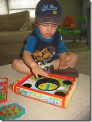 We found Candyland, and we’ve had fun playing it together. After 3 or 4 tries, Alex has caught on to the rules. It’s actually kind of fun to play with him now that he understands!