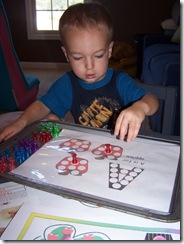 Oh, how he didn’t enjoy this! The goal is to use the colored pompoms to complete the pattern. Alex preferred to just randomly put pompoms on all the apples, giving no thought to color. I think we’ll wait a while before trying this one again! These in the picture were completed with a HUGE amount of guidance from Mom!