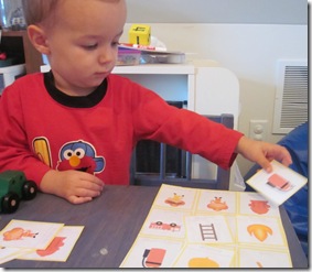 More matching with Max. I left one sheet of the nomenclature cards whole, and then Max matched the pictures. Maybe some day we’ll use these for their intended purpose, but this works for now! :)