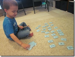 Alex drew a lowercase card from the pile, named the letter, and used our magnetic fishing pole (Melissa & Doug puzzle) to fish for the matching uppercase letter.