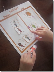 Sorting people and food, gluing into the correct boxes. I drew a smiley face in the people box & an apple in the food box. I cut out the pieces for Max, explained how to sort them, and he did the rest perfectly.